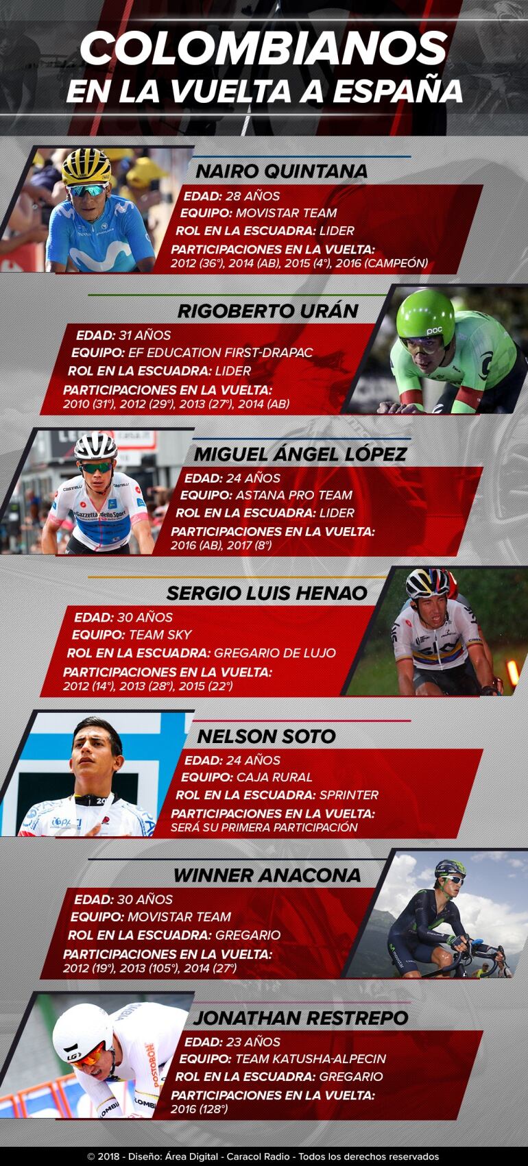 La Vuelta España en su edición 73 iniciará el próximo sábado y contará con la participación de siete colombianos que buscarán dejar en alto el nombre del país en una de las pruebas ciclisticas más importantes.