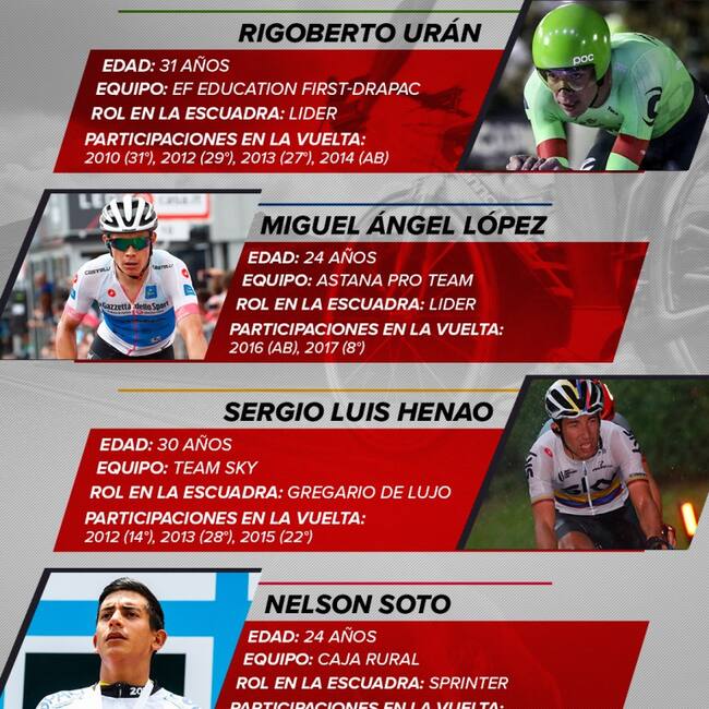 Nairo Quintana, Rigoberto Urán, Miguel Ángel López, Sergio Luis Henao, Winner Anacona, Nelson Soto y Jonathan Restrepo serán los colombianos en competencia.