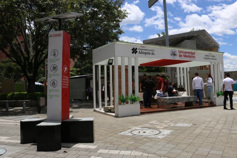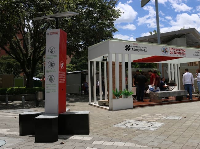 La Universidad de Medellín le apuesta a la sostenibilidad con su banca solar en la feria de construcción e innovación EXPOCAMACOL, mostrando una banca solar construida en concreto constituido por un panel solar que en un costado tiene 4 puertos USB que permiten cargar los equipos móviles.