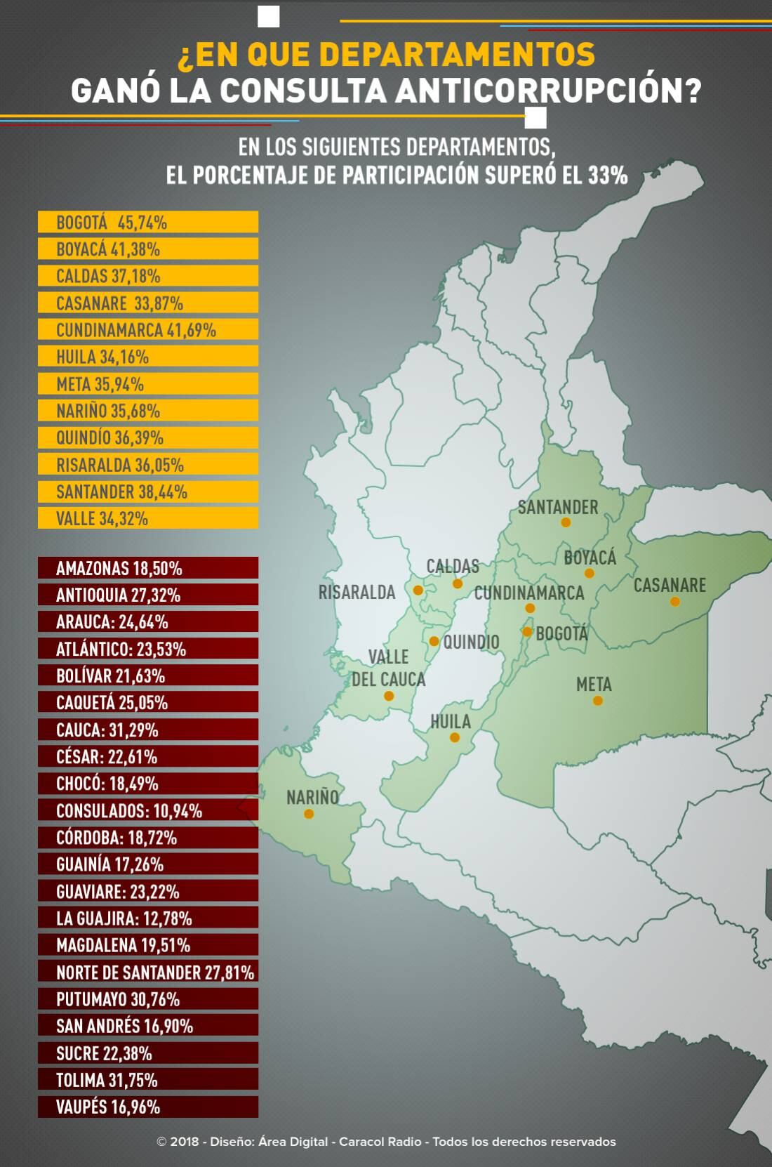 Bogotá, Boyacá, Caldas, Casanare, Cundinamarca, Huila, Meta, Nariño, Quindío, Risaralda, Santander y Valle superaron el 33% de la participación en esta consulta; mientras que los demás departamentos del país se “rajaron” en esa cifra.