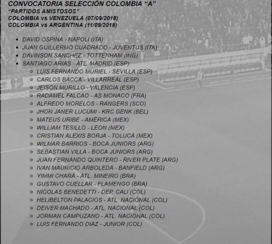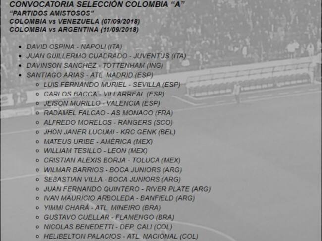 Arqueros: David Ospina (Napoli - ITA) e Iván Arboleda (Banfield - ARG)