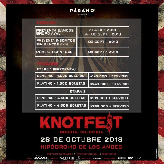 Los fanáticos de este espectáculo podrán adquirir las primeras entradas en la Preventa del Grupo Aval que estará activa, únicamente para los clientes de Aval y los inscritos a knotfestcolombia.com que tengan tarjetas de bancos Aval, Yeii o Aval Pay a partir del viernes 31 de agosto a las 9:00 AM y durante 72 horas, finalizando el lunes 3 de septiembre a las 9:00 AM.