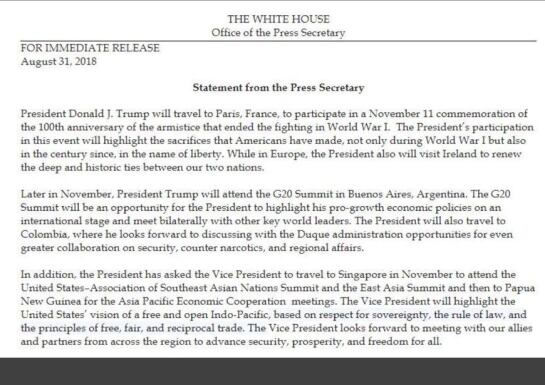 Trump también tiene planes de viajar a Francia para la conmemoración número 100 del armisticio que terminó el conflicto de la Primera Guerra Mundial. Y aprovechará la ocasión para visitar Irlanda para “renovar las relaciones bilaterales”.