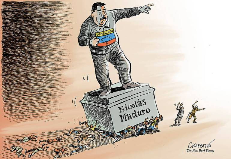 “Venezuela sufre una crisis económica y política que ha empujado a sus ciudadanos a un éxodo masivo. Nicolás Maduro parece dirigir a la nación a una tragedia humanitaria”, escribió The New York Times al pie de la caricatura.