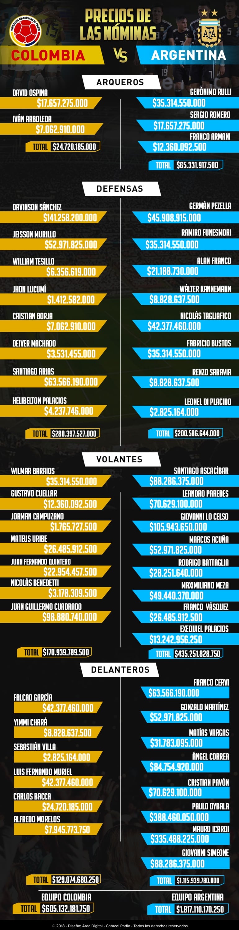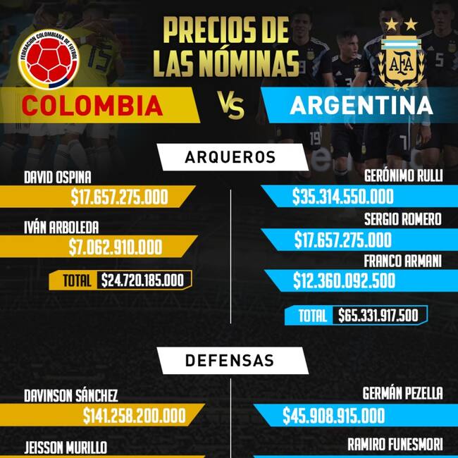 Sin embargo, según los valores del portal Transfer Market, el combinado 'Albiceleste' triplica al equipo 'Tricolor, siendo Dávinson Sánchez el jugador colombiano de mayor valor y Paulo Dybala, el argentino más costoso y a la postre el de un precio más alto en el mercado entre ambos equipos.