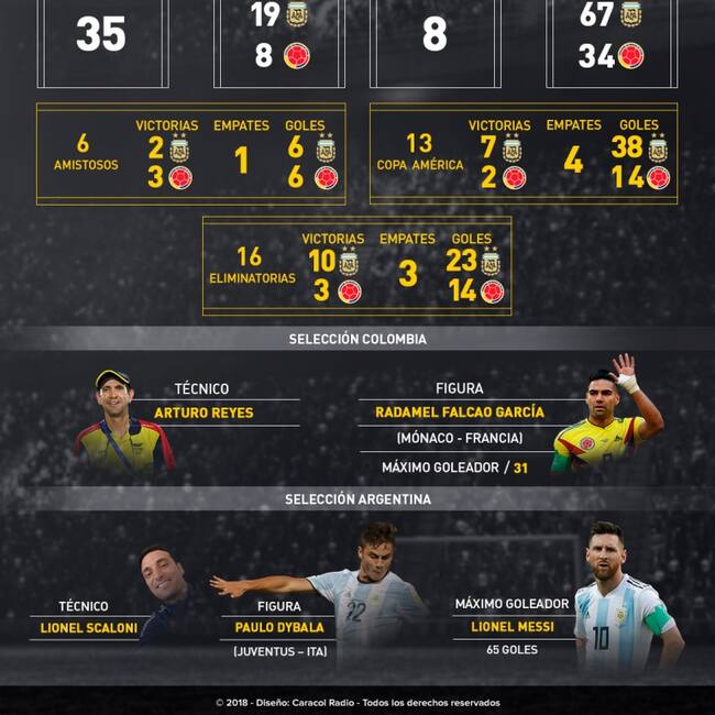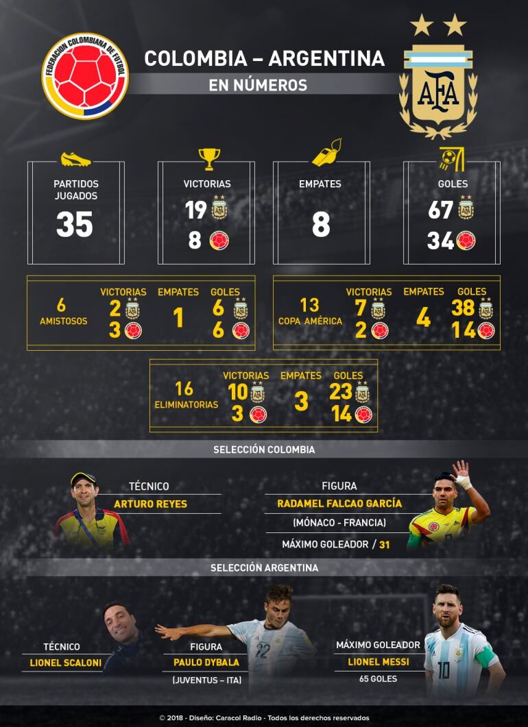 Argentina y Colombia se enfrentarán en su partido número 36, y será el séptimo como duelo amistoso. Los nuestros han conseguido ocho victorias y 34 goles, mientras que los albicelestes van a la cabeza con 19 triunfos y 67 tantos. Solo ocho empates hay en el historial entre ambas selecciones.