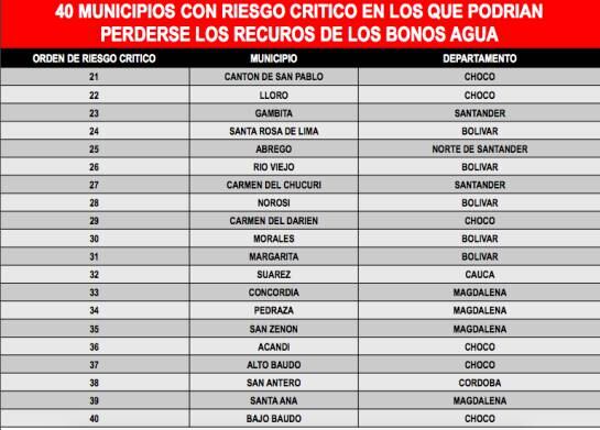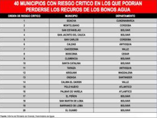 Este es el listado de los 40 municipios que más plata perdieron con los bonos de agua.
