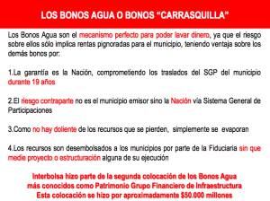 “En cuanto a los Bonos Agua, fueron unos papeles estructurados por el ex-ministro de Hacienda Alberto Carrasquilla y el ex-director de Fogafín, Andrés Flórez para financiar la construcción de acueductos en los municipios colombianos en donde el rol de InterBolsa fue el de colocador en vista del fracaso del primer intento de colocación por parte de otra entidad… Nuevamente hace usted alusión a un 'posible' lavado de dinero… estos Bonos se encuentran hoy en día en su gran mayoría en poder de los Fondos de Pensiones y no creo que hayan prestado para las maniobras fraudulentas que usted mencionó en el debate”.
