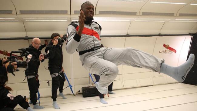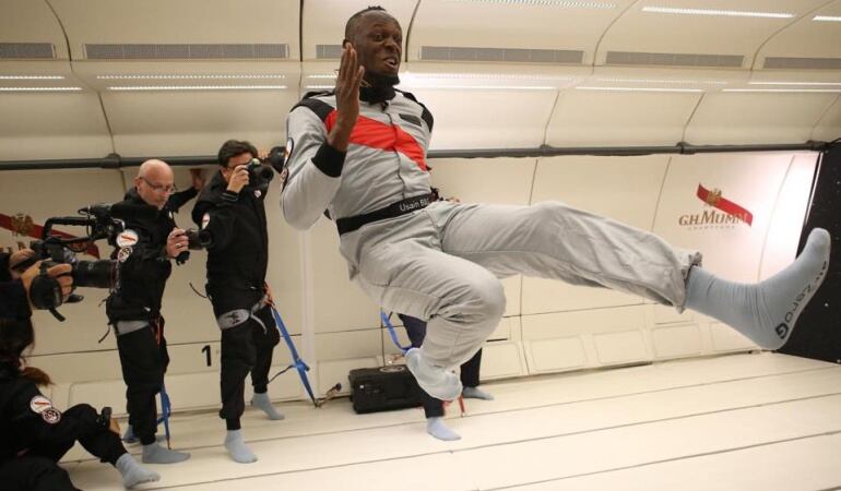La leyenda del atletismo Usain Bolt intentó correr en un avión modificado en condiciones de gravedad en un acto publicitario.