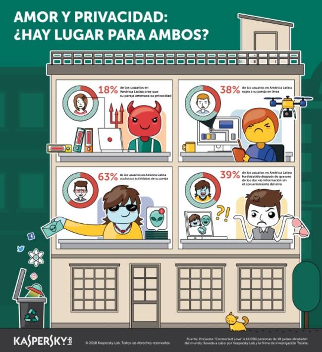 El papel de la privacidad está cambiando en las relaciones actuales. Según investigación de Kaspersky Lab se encontró que en Colombia el 86% de personas creen que las parejas deben tener un espacio privado. Sin embargo, el 46% comparte abiertamente contraseñas y pines de ingreso a sus dispositivos.
