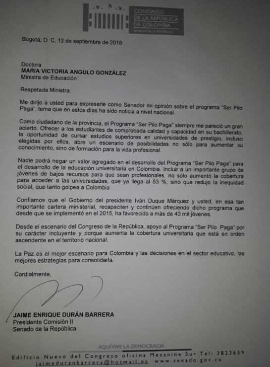 El presidente de la Comisión Segunda del Senado, Jaime Enrique Durán, se sumó al llamado de los estudiantes beneficiarios de ‘Ser Pilo Paga’ y exhortó al Gobierno Nacional para que aumente en el Presupuesto Nacional la inversión en las universidades públicas y no se acabe con el programa.
