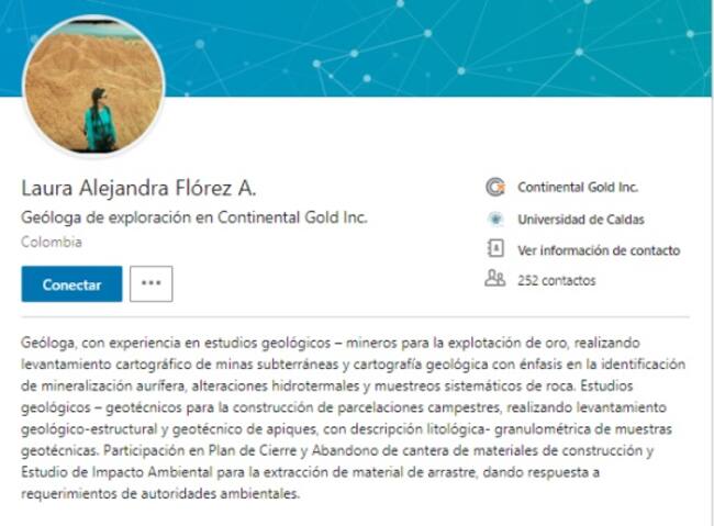 Orgullosa de trabajar para Continental Gold y con una hoja de vida brillante en el desarrollo de proyectos mineros, Laura Alejandra Flórez destacaba sus principales logros en sus redes sociales.