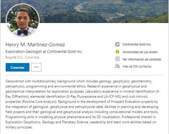 Con un amplio perfil profesional en conocimientos de geología, geofísica, geoquímica, petrofísica, programación y ética ambiental; el joven comenzó a trabajar en la multinacional minera canadiense Continental Gold en marzo del 2018.