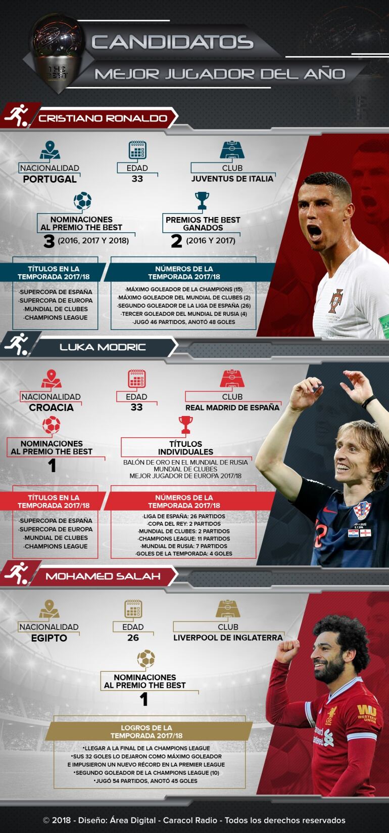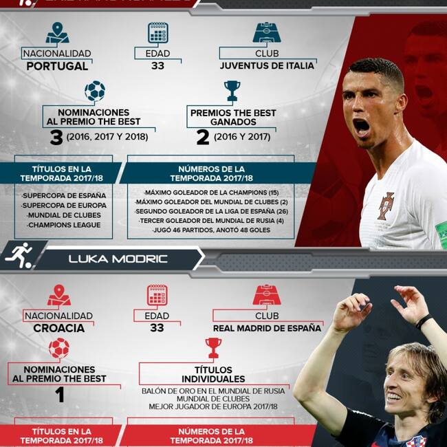 Luka Modric (Real Madrid), Cristiano Ronaldo (Juventus) y Mohamed Salah (Liverpool), son los tres nominados para quedarse con el premio al mejor jugador del año en los premios The Best de la FIFA.