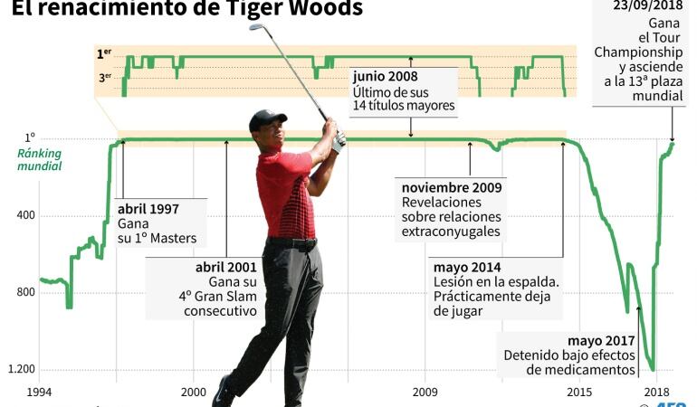 Tras 1.876 días sin ganar un solo torneo, Woods se quedó recientemente con el trofeo del Tour Championship y parece tomar un segundo aire en su exitosa carrera, en la que ha cosechado 80 títulos.