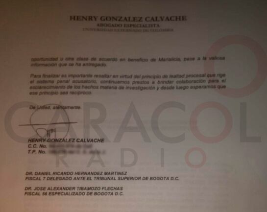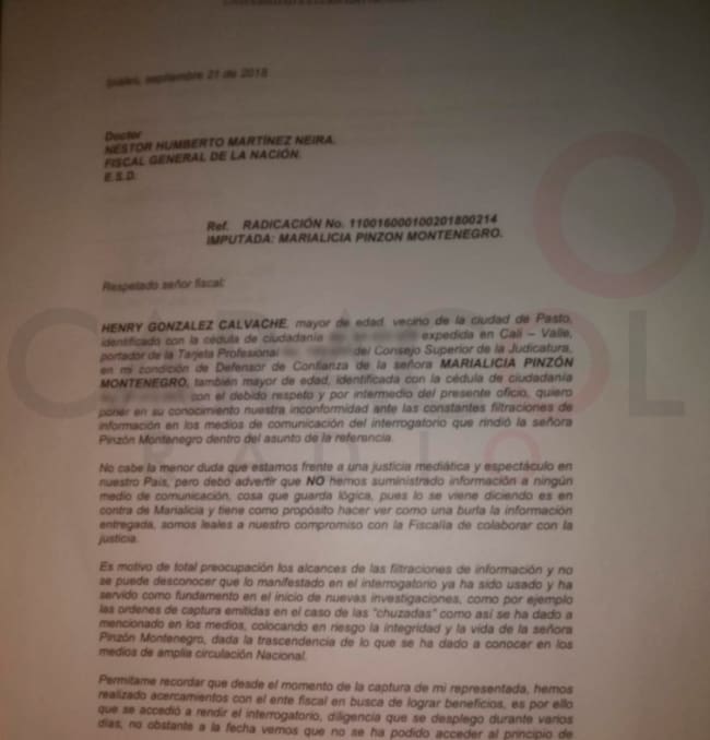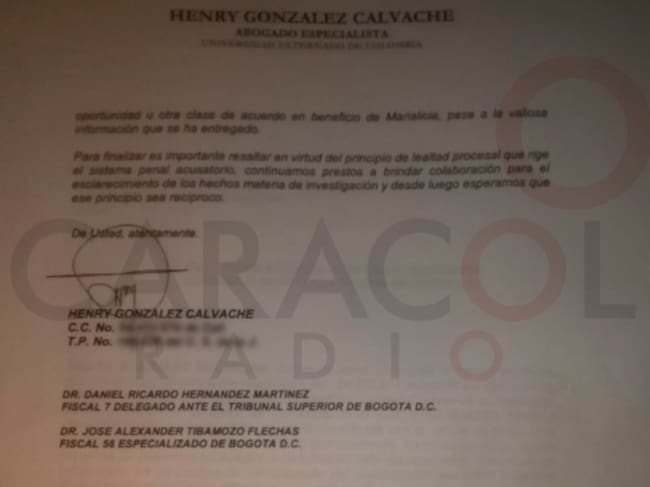 González Calvache dijo en el documento, que ya está en manos del fiscal general, que el interrogatorio que brindó su cliente fue fundamental para avanzar en este proceso e incluso conseguir la captura de otras personas.
