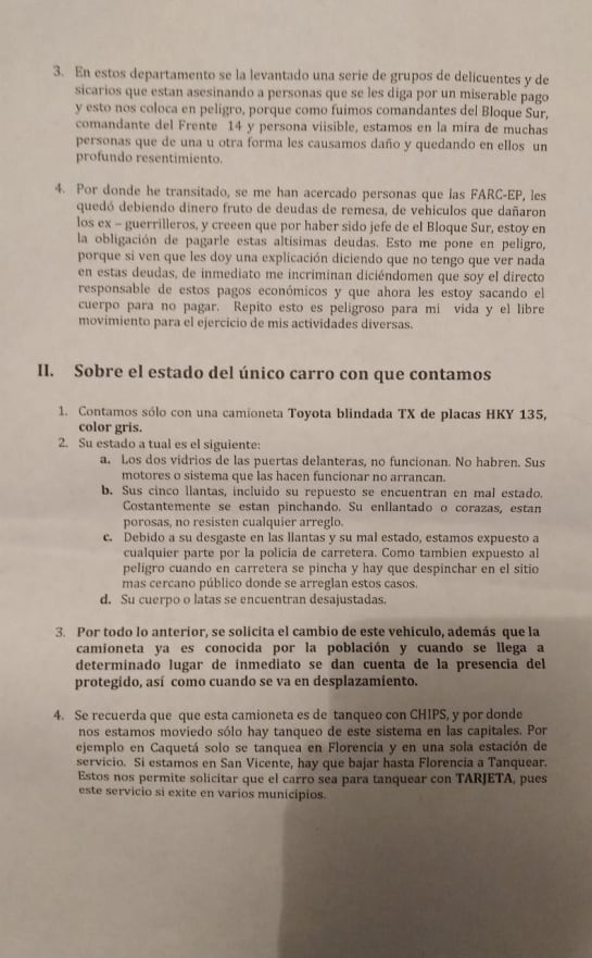 En la misiva explica que en la actualidad solo tiene una camioneta blindada, según él en mal estado, y dos escoltas con armas pero que por el estudio de seguridad tiene derecho a otro vehículo y dos hombres más.