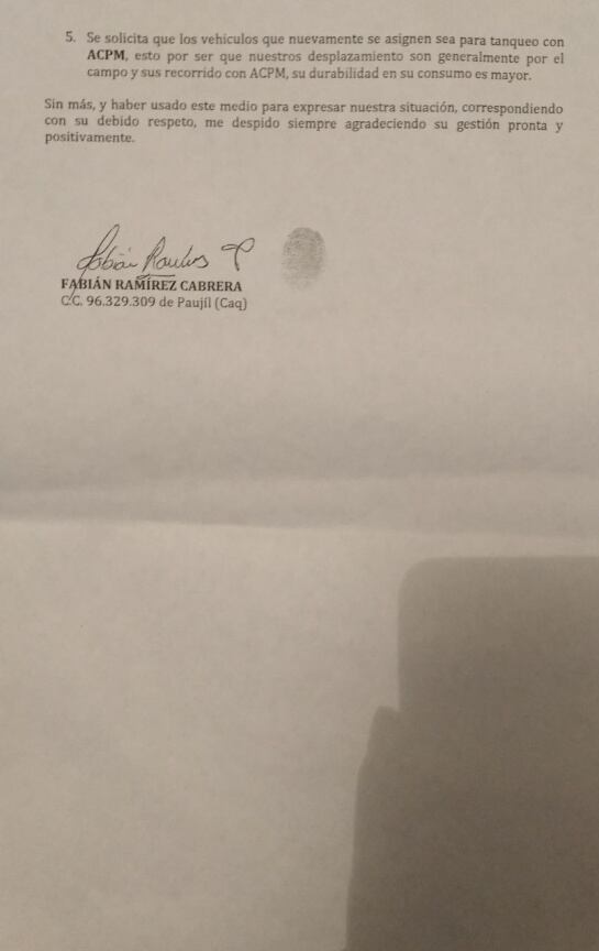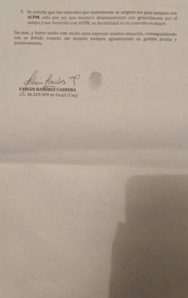 Dentro del pliego de peticiones del excombatiente está la de cambiar las camionetas de gasolina por unas diesel ya que son “más económicas” para los traslados y que se le asigne una tarjeta para “tanquear los carros sin problema”.