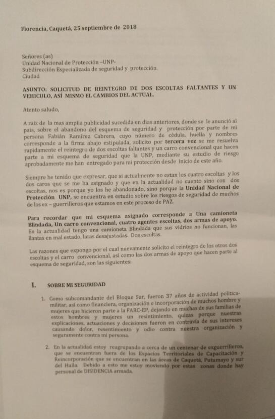 A través de una carta el excomandante del Bloque Sur de las Farc Fabían Ramírez, pidió a la Unidad Nacional de Protección que le sea asignado de nuevo el esquema completo de seguridad que en principio se le había asignado.