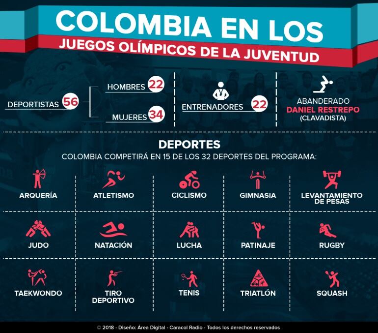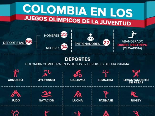Este sábado 6 de octubre inician los Juegos Olímpicos de la juventud, y la delegación colombiana está compuesta por 56 deportistas que competirán en 15 de los 32 deportes del calendario.