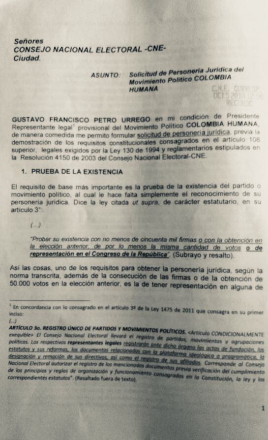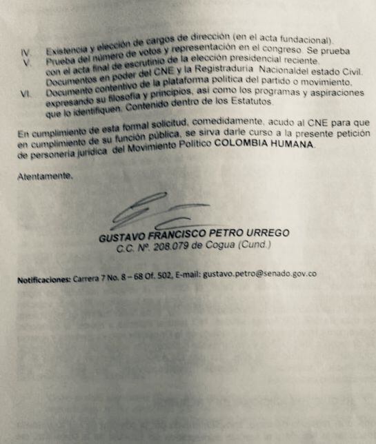 En su calidad de representante legal de la Colombia Humana, Gustavo Petro solicitó una vez más al Consejo Nacional Electoral que se le otorgue la personería jurídica ya que, según él, se cumple con todos los requisitos de ley para hacer esta petición.