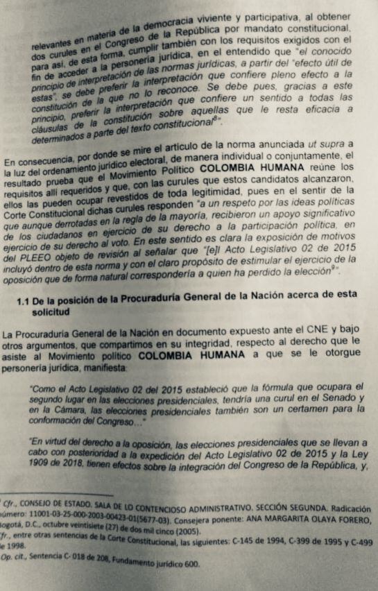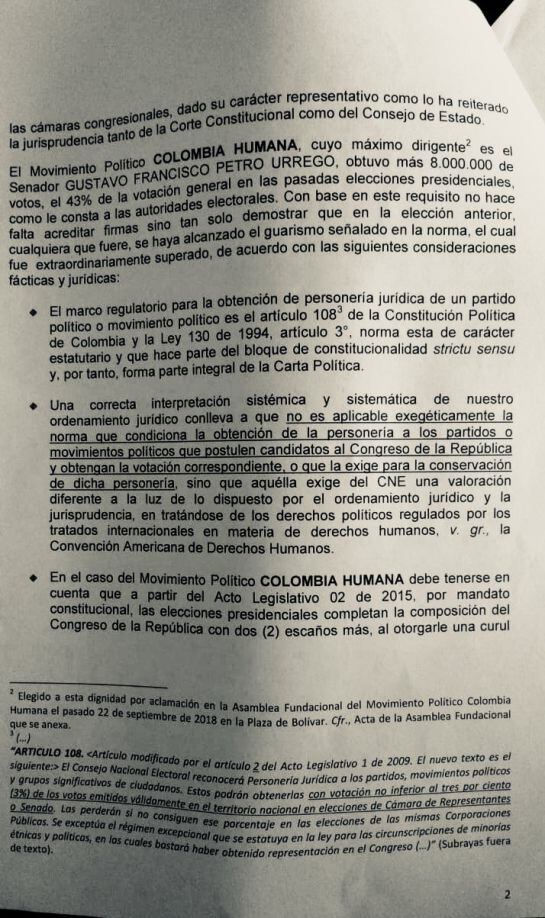 “El movimiento político Colombia Humana cuyo máximo dirigente es el senador Gustavo Petro, obtuvo más de 8 millones de votos en las pasadas elecciones presidenciales, como le consta a las autoridades electorales. Con base en este requisito no hace falta acreditar firma sino tan solo demostrar que en la elección anterior cualquiera que fuere, se haya alcanzado el guarismo señalado en la norma, el cual fue extraordinariamente superado”.
