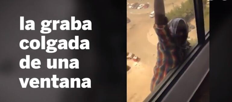En las imágenes se observa a la mujer sujetada de una sola mano, de la ventana de un edificio, también en la grabación se puede ver como la empleada de origen etíope, le suplica a su empleadora agarre su mano.