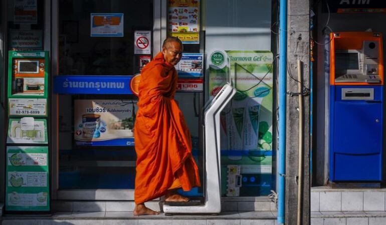 Phramaha, con la cabeza y las cejas rapadas y vestido con una túnica anaranjada, asegura que al cumplir los 30 años cambió sus hábitos y ahora bebe agua y zumo, aunque precisa que este hábito no es generalizado en los monasterios budistas.