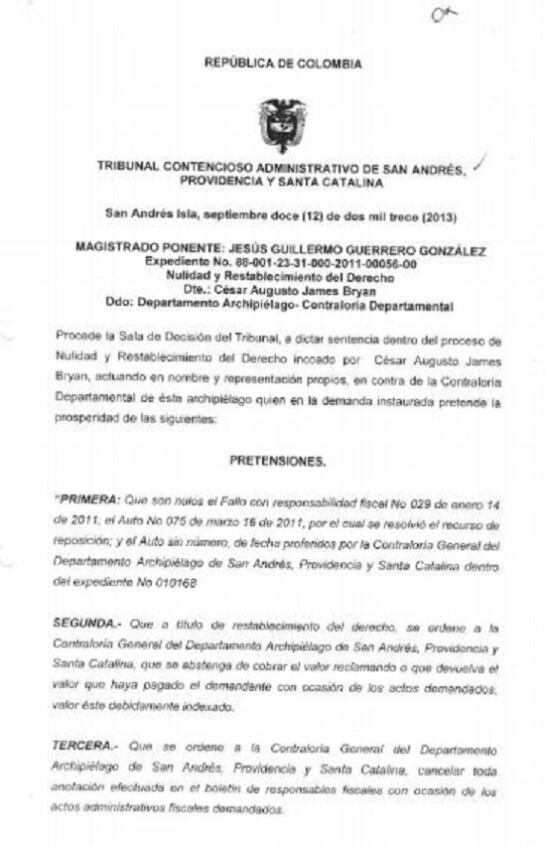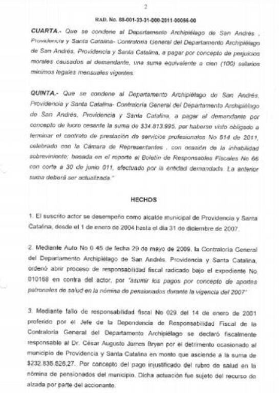 James demandó las decisiones de la Contraloría cuando ya fungía como Secretario Departamental. Le pidió al Tribunal de San Andrés que obligara a la Contraloría a desistir de la multa en su contra y a la Gobernación, su empleador en ese momento, que le pagara una millonaria indemnización por lo que consideró daños y perjuicios.