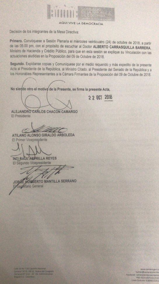 “Convóquese a la sesión plenaria el miércoles 24 de octubre a partir de las 5:00 pm, con el propósito de escuchar al doctor Alberto Carrasquilla, Ministro de Hacienda, para que en esta sesión se explique su vinculación con las actuaciones aludidas”, dice el documento.