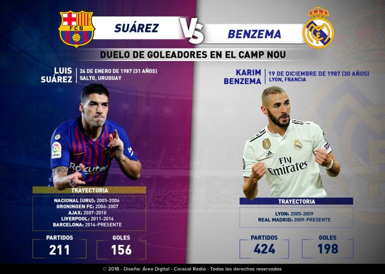 Luis Suarez y Karim Benzema, vivirán un duelo aparte en el clásico de España en su edición 239. El uruguayo registra 156 goles en 211 partidos con el Barcelona, mientras que el francés tiene 198 tantos en 424 encuentros con la camiseta blanca.