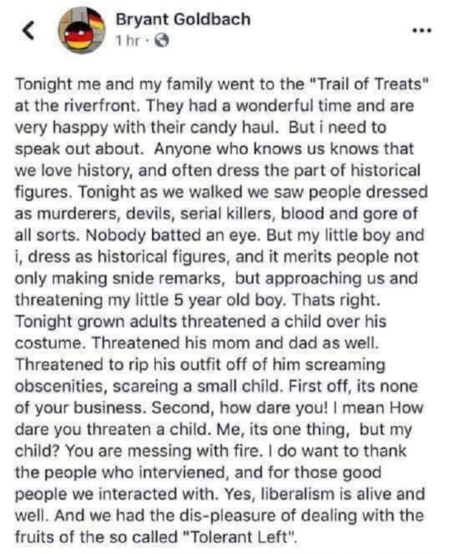 “Mientras caminábamos, vimos personas vestidas como asesinos, demonios y monstruos de todo tipo. Nadie pestañeó. Pero mi pequeño y yo nos vestimos como figuras históricas, y la gente no solo hizo comentarios sarcásticos, sino que amenazaron a mi hijo de cinco años” afirmó el padre del menor en Facebook.