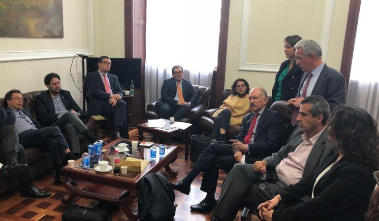 Allí, en la misma mesa, con bolígrafo y papel en mano, Uribe y su bancada se sentaron frente a frente a Carlos Antonio Lozada, Victoria Sandino y Pablo Catatumbo, excomandantes de las Farc y ahora senadores.