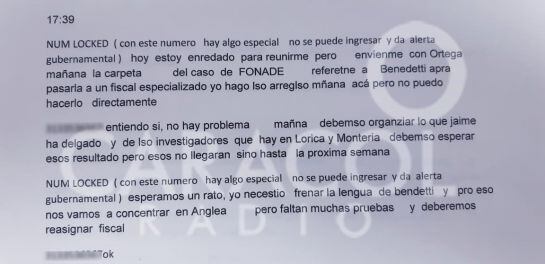 En una conversación del 11 de noviembre de 2017 se habla de seguimientos a alguien que identifican como Benedetti y del supuesto interés de presidencia en un caso. La conversación ocurre entre dos abonados telefónicos, uno identificado como Natalia Londoño y otro bloqueado
