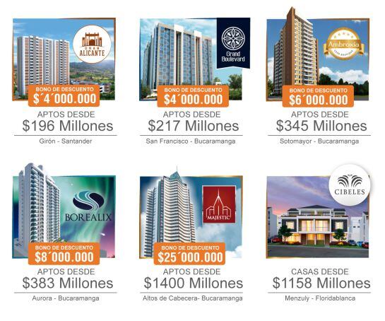 En Bucaramanga cuentan con 6 proyectos en oferta con inmuebles desde $196 millones hasta proyectos de lujo como es el caso de Majestic, el icono de Bucaramanga con precios desde $1.400 millones de pesos y CIibeles, casas campestres en el Valle de Menzuly (Floridablanca) con precios desde $1.158 millones y amplio plazo para pagar la cuota inicial.