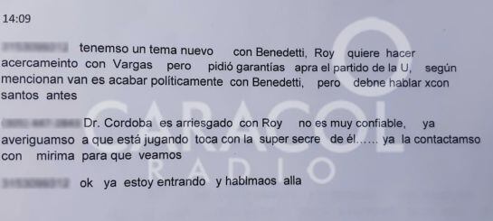En las interceptaciones entre dos abonados telefónicos, plenamente identificados se mencionan a Benedetti, Roy y Vargas, supuestamente para acabar políticamente al primero de ellos.