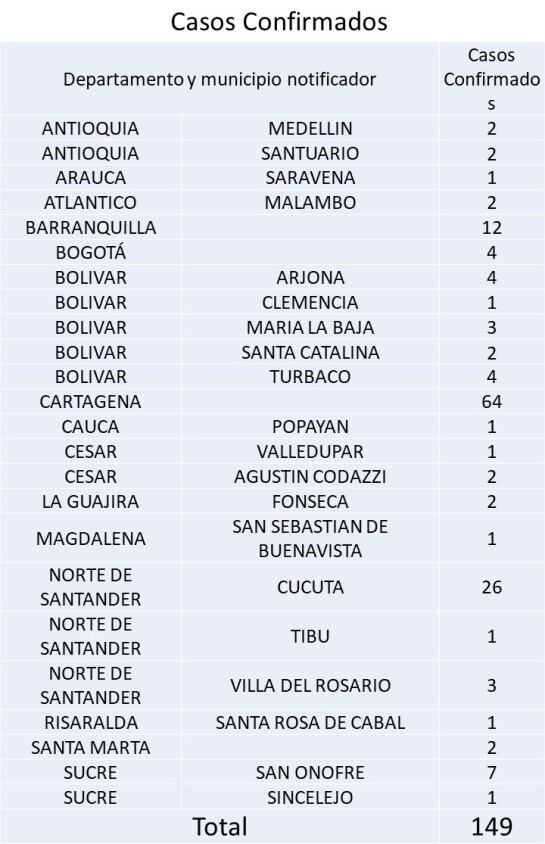 La ciudad con más casos es Cartagena, con 64, seguido por Barranquilla, con 12, y Cúcuta, con 16. Otros cuatro de los casos fueron confirmados en Bogotá, 4 en Antioquia.