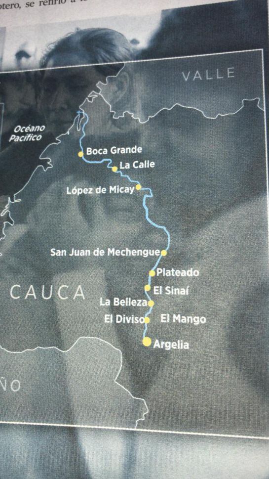 La ruta ha explicado el defensor comienza desde Argelia, sigue por El Diviso, El Mango, La Belleza, El Sinaí, Plateado, San Juan de Mechengue, López de Micay, La Calle, Boca Grande hasta el Pacífico.