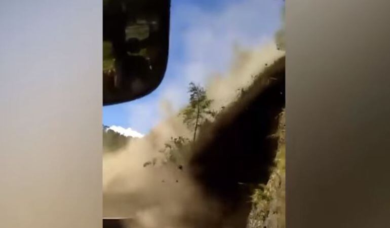En un video que tomo el momento exacto que una montaña se desploma se puede observar como el conductor logra dar reversa rápidamente evitando que la tierra que se desliza catapulte el bus en medio de la carretera.