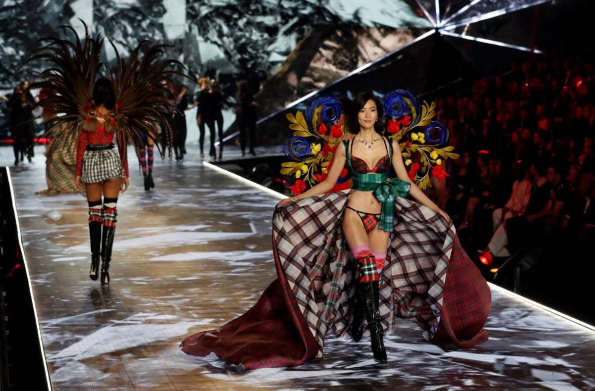 La modelo china Liu Wen (dcha) cruza la pasarela con un diseño de la firma de lencería Victoria's Secret en el ámbito del desfile de la marca en Nueva York