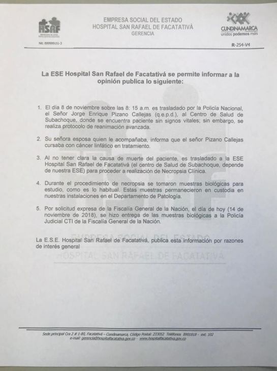 "Al no tener clara la causa de la muerte del paciente es trasladado al hospital San Rafael de Facatativá para proceder a la realización de la necropsia clínica", señaló el hospital en su comunicado.