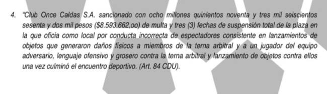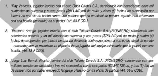 La Dimayor, emitió el comunicado en el que se lee la resolución 047 del comité Disciplinario del Campeonato, y en el que se leen las sanciones impuestas al estadio Palogrande, al jugador Stefano Arango, al jugador Ray Vanegas y al técnico Jorge Luis Bernal, tras las acciones sucedidas en el juego Once Caldas Vs Rionegro.