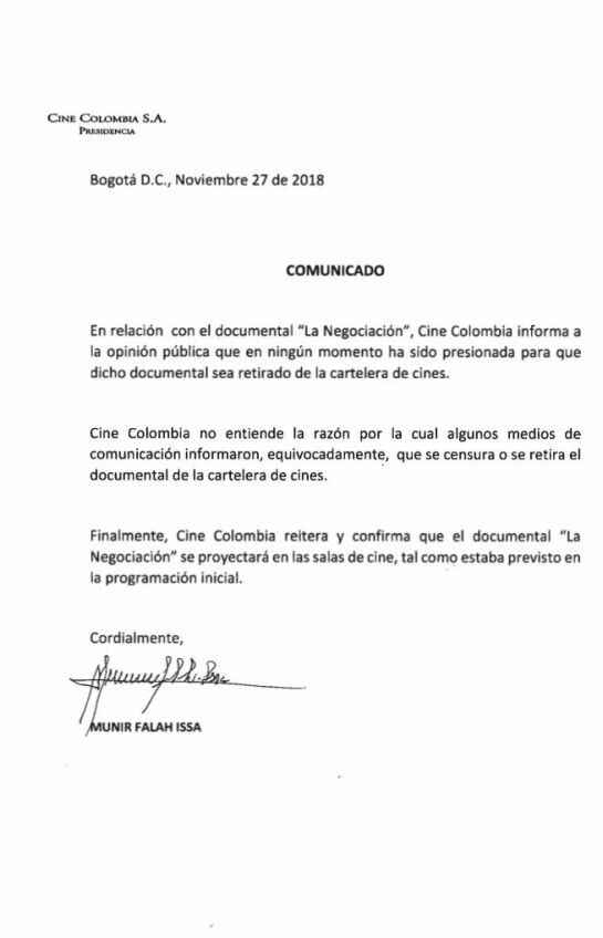 "Yo quisiera que todas las partes involucradas permitieran a este documental verse. Munir Falah (Director Cine Colombia) me llamó esta mañana, yo creo que él todavía está reevaluando", indicó.