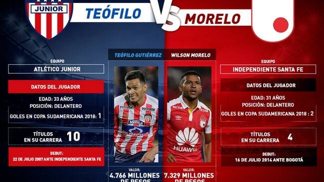 Teófilo Gutierrez del Junior y Wilson Morelo de Independiente Santa Fe, sostendrán un duelo particular en el partido en el que barranquilleros y bogotanos buscarán el pasaje a la gran final de la Copa Sudamericana.