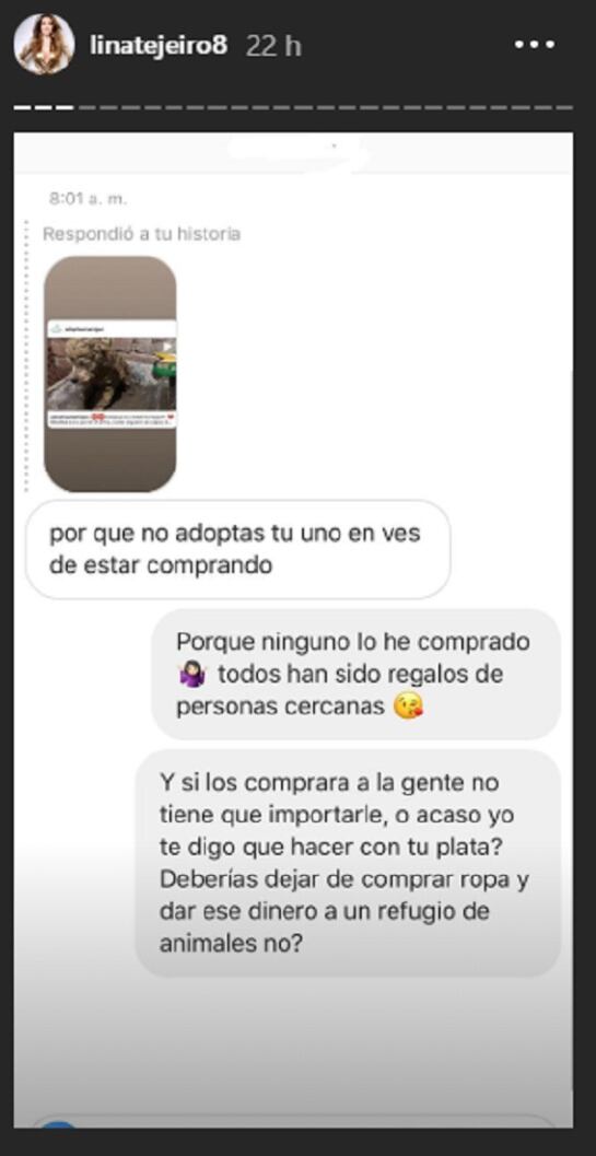 Fuerte respuesta de Lina Tejeiro a seguidora que crítico sus mascotas