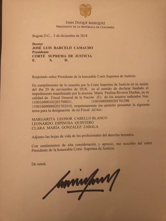 En un mensaje previo a la entrega de la terna, el presidente Duque escribió que espera celeridad en la elección, que se esclarezcan los hechos y que se conozca toda la verdad.
