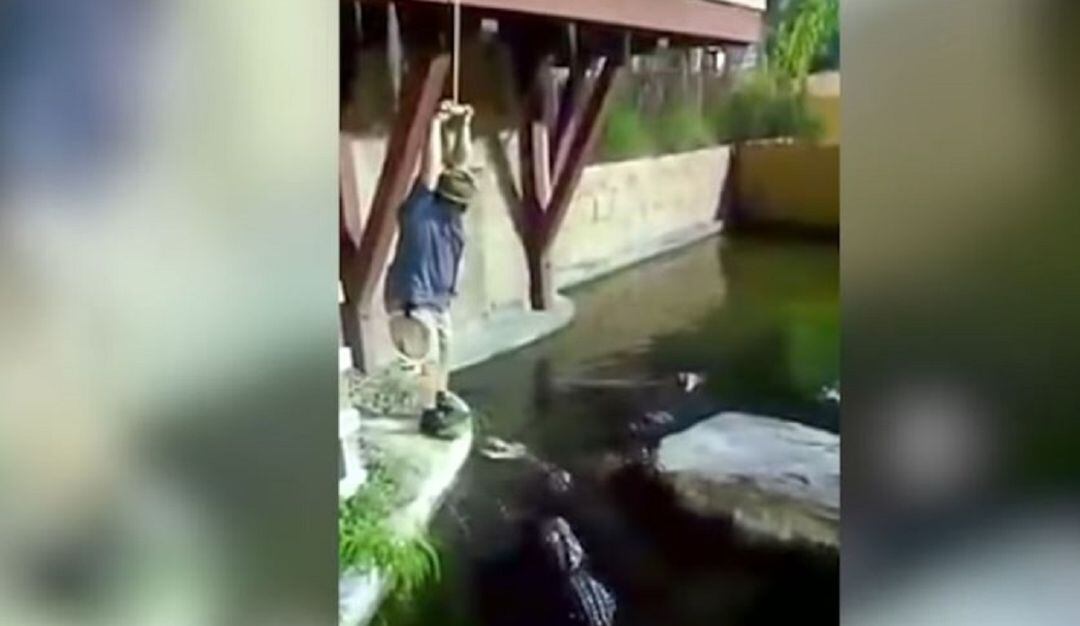 ‘The Gator Crusader’ fue grabado cuando se colgó de una cuerda para estar unos minutos sobre los caimanes, pero al sujetarse la cuerda se rompió y cayó sobre los caimanes.