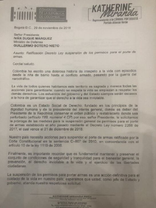 La representante a la Cámara Katherine Miranda señaló que la petición se basa en que se debe tener este decreto para proteger a los ciudadanos y que por esa razón, junto al senador Antanas Mockus, se hizo la recolección de las firmas.