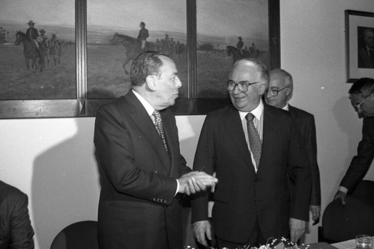 Belisario Betancur acompañado de Álvaro Uribe Velez