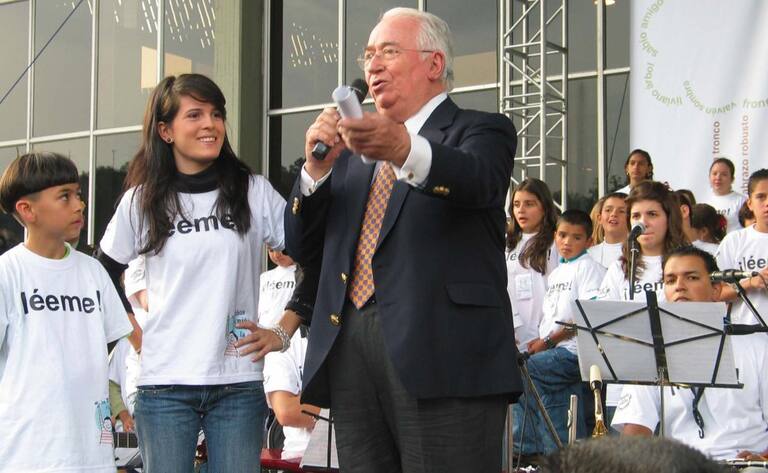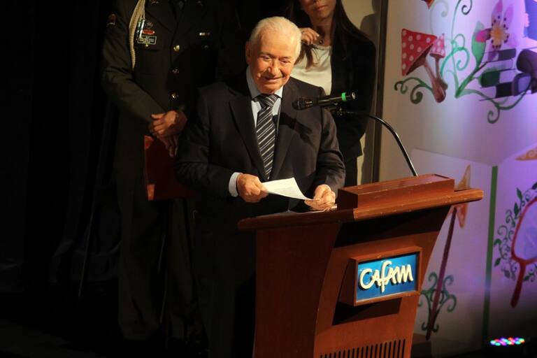 El ex presidente Belisario Betancur en el teatro de Bellas Artes de Cafam. celebración del Festival Iberoamericano de literatura infantil.